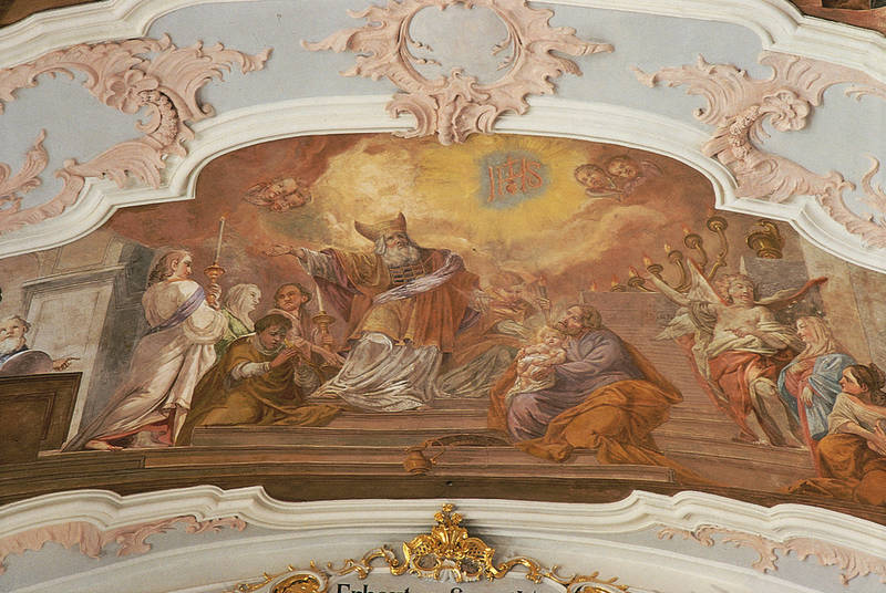 Matthäus Günther begann seine Arbeit 1743/44 über der Orgelempore, 1751 wurde das Langhausgewölbe ausgemalt (Anbetung der Hirten, Anbetung der Könige; Darstellung Christi im Tempel, Tod des hl. Josef) und 1755 entstanden die Wandfresken im Chor (Verlobung des hl. Josef mit Maria sowie die hl. Sippe, die Darstellung der Verwandten Jesu).