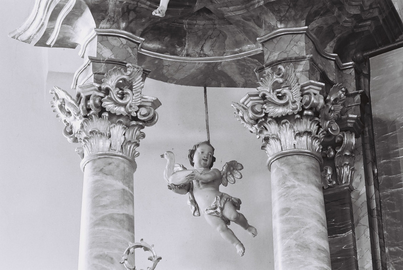 Oftmals sind die Engelkinder Begleiter von szenischen Darstellungen und tragen dabei die Attribute der abgebildeten Heiligen – hier die Gans des hl. Martin.