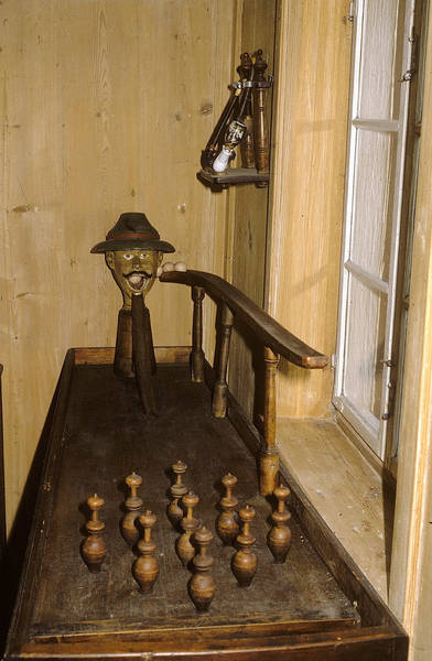 Ein solches Tischkegelspiel stand früher im nicht mehr bestehenden Gasthof Grüner Baum in Tannheim und ist heute im örtlichen Museum zu besichtigen. Über eine schräge Rinne auf drei Balustersäulchen rollen die Kugeln in den geschnitzten Kopf eines schnurrbärtigen Mannes mit Tirolerhut, der die Kugeln durch seinen geöffneten Mund über eine steile Rinne auf die gedrechselten Kegel am Ende der Bahn ausspeit. Durch einen Schiebemechanismus am unteren Ende der Bahn kann der Spieler den Kopf der Figur schwenken und damit die Richtung der Kugel beeinflussen.